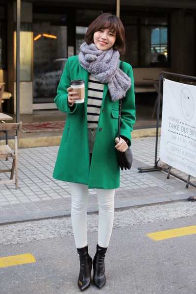 绿色大衣清新怡人,带来春天般的美好气息,看着就觉得很舒服,让人如沐春风,款式经典简约,口袋设计很别致,搭配条纹毛衣和白色紧身裤,更加清新大方。
