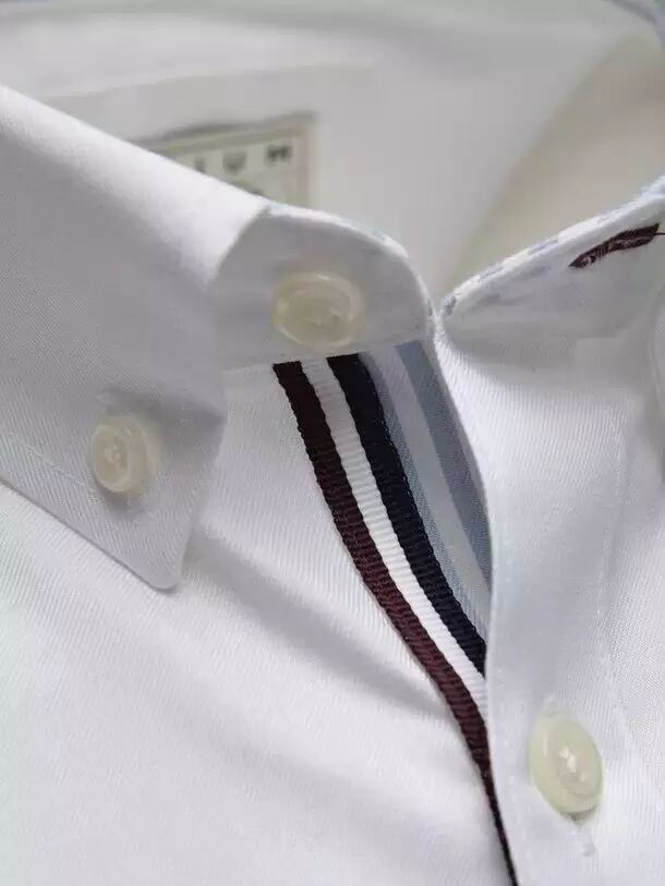 衬衫的辅料比较简单,普通衬衫用的是聚酯扣,稍微好点的用普通贝壳扣,顶级品牌的一般用高档贝壳扣。大多数高端衬衫都采用1.8mm贝母扣,还有采用3.5mm的贝母。最佳厚度是2.5mm,手感舒服,略内凹的纽扣光泽感和手感更佳,有些品牌还会刻上自家的logo。而有些会将扣子则设计在内侧,叫做暗扣,个人不是很喜欢,感觉略显轻浮。