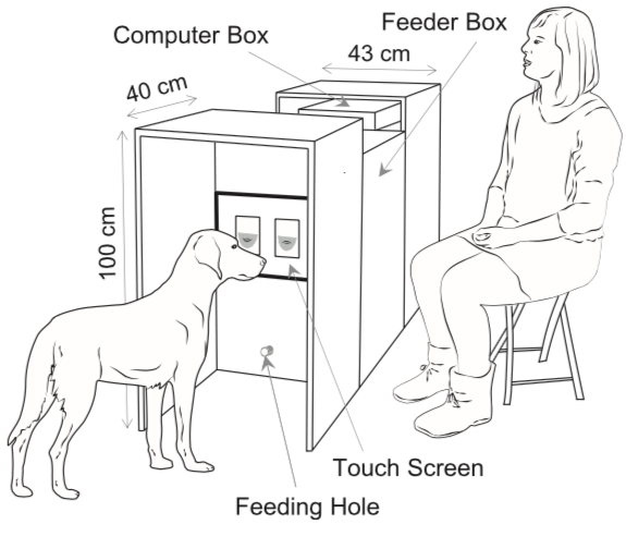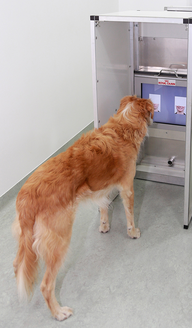 胡伯选取了家养宠物狗作为研究对象――宠物狗与人类的相处时间较长,它们更可能识别出人类的表情。为了进行表情识别实验,胡伯首先搭建了一个人与狗的互动装置。在汪星人被安置在机器的一侧,它面前的触摸屏可以显示图片,触屏下方有奖励食物的孔道。