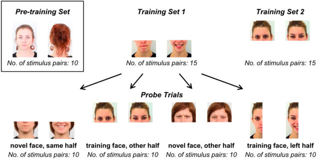 预训练(Pre-training)、训练(Traing)及四种测试(Probe Trials)的图样展示。所有图片均为白人女性,其中预训练的10张照片为实验工作人员;作为训练和实验的25张照片则来自网络数据库。测试过程中所选用的四种方式分别是:与训练时同一张脸的另外半边(下,左二);与训练时同一张脸的左半边(下,右一);另一张脸与训练时的同半边(下,左一);以及另一张脸的另外半边(下,右二)。图片来源:参考文献
