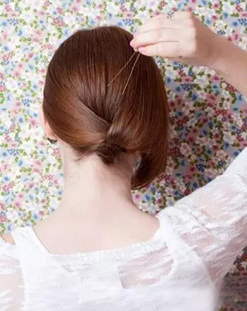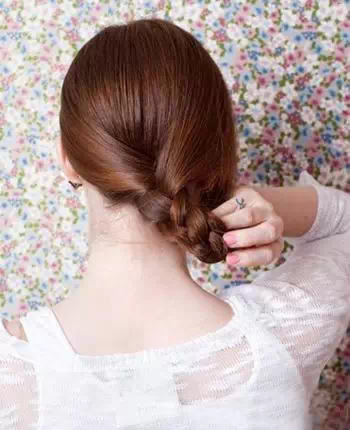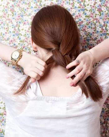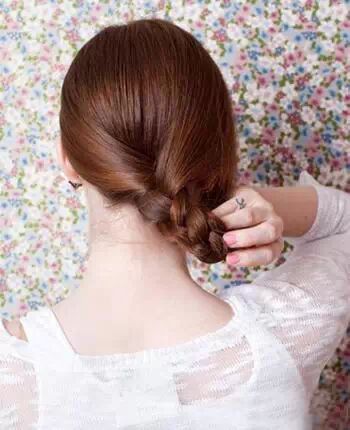 步骤三:抓住麻花辫的发尾,向里侧回折,将回折的部分塞入到麻花辫根部的头发中。
