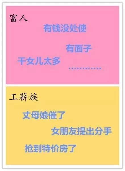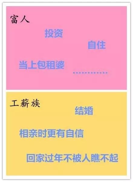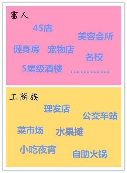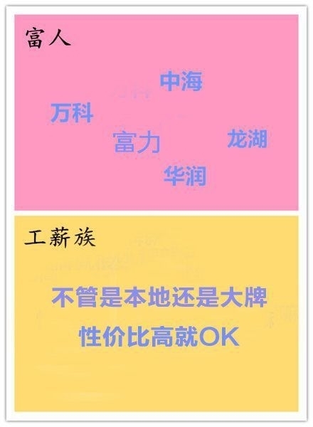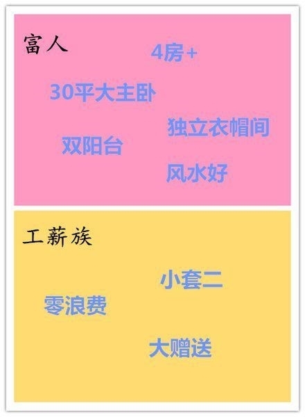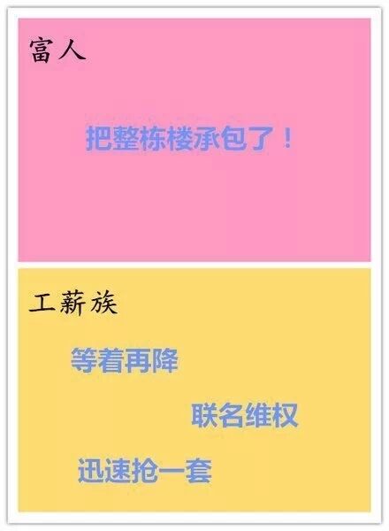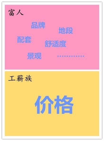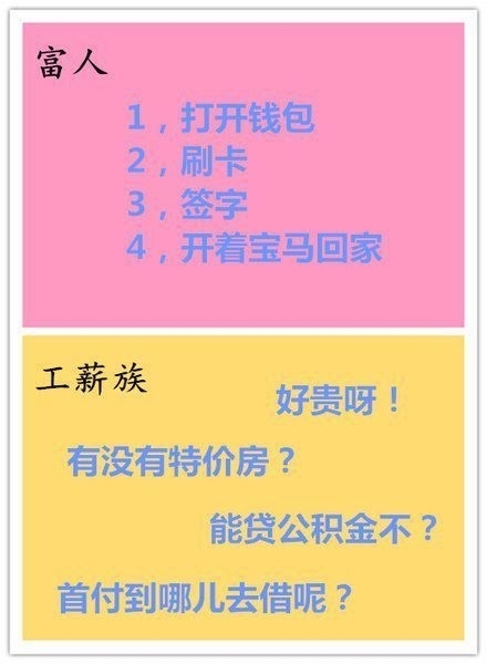 因为收入,需求,社会地位等各方面的差异,有钱人和没钱人无论是在什么时候都呈现出截然不同的状态。现如今房价差异越来越大,购房族群也逐渐分化。(转自:网络;作者:佚名)