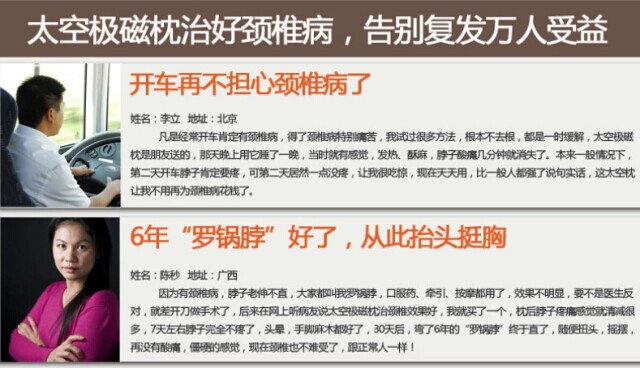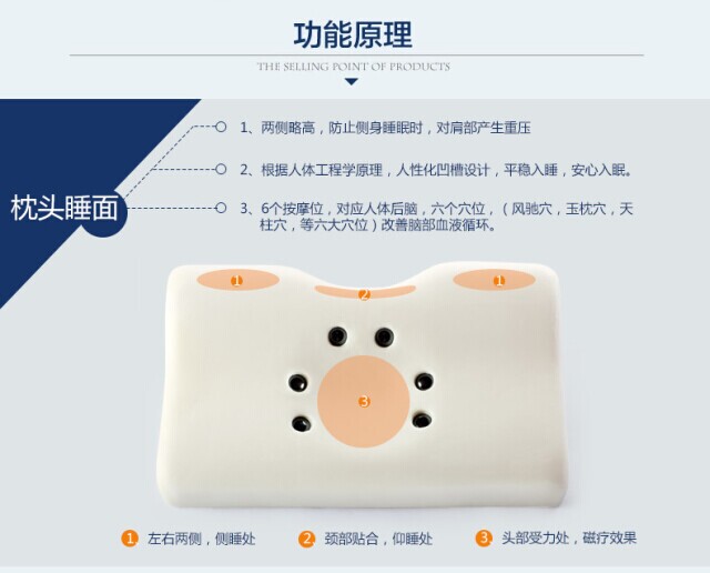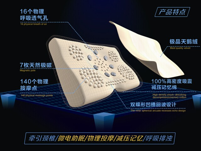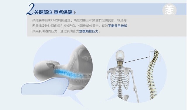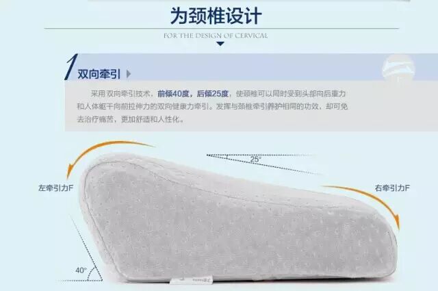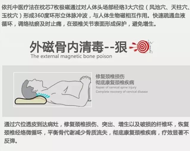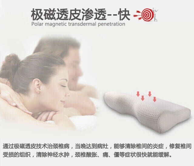 不牵引,无痛苦。换上极磁枕,以上问题通通去无踪!!最大程度满足人体工程学设计,采用蝶形凹槽回波枕型设计完全符合人体工程学原理,枕型采用内球面和蝶形凹槽回波设计,使用时紧贴颈部曲线,对颈椎形成180度全方位立体保护。今天用,今天享,一生用,享一生!