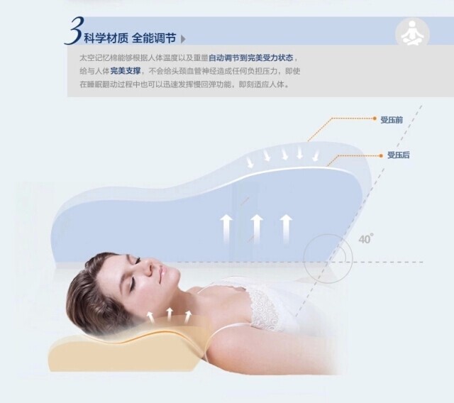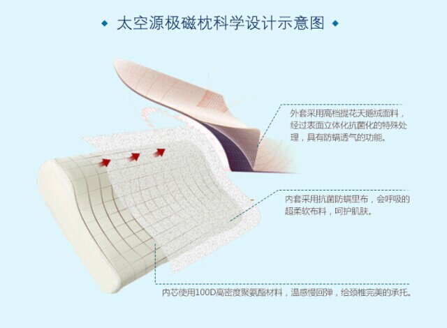 太空源极磁枕会自动产生记忆,使身体在任何睡姿下都能获得头、颈椎、胸椎保持水平,保证椎动脉畅通、充足的大脑供血、供氧,形成“自然牵引”和“矫正修复”的功能,改善睡眠,缓解、消除颈椎疾病并预防因脑功能障碍而造成的心脑血管等疾病。