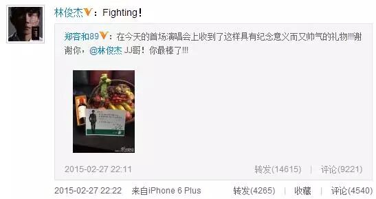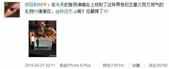27日晚10点11分,郑容和更新微博“在今天的首场演唱会上收到了这样具有纪念意义而又帅气的礼物!谢谢你,@林俊杰JJ哥!你最棒了!”而照片中林俊杰手写卡片的内容也随之公开,林俊杰用韩文认真写道