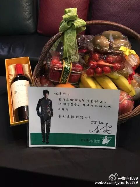 2月27日晚,韩国人气乐队CNBLUE队长郑容和在首尔举行首场个人演唱会,林俊杰特意送上果篮、红酒和一张手写的韩文贺卡表达心意。演唱会结束后,郑容和在微博上上传了林俊杰送来的礼物,并留言感谢。