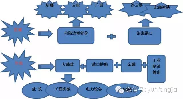 一带一路主要受益公司主要从区域和行业属性两个维度来寻找。首先处于一带一路战略节点地域的上市公司将直接受益,如边境地区的新疆、云南、广西等。其次从行业属性上看,一带一路沿线国家大部分为欠发达国家,基础设施较为落后,城镇化程度较低,基建需求最为明显,因此大基建行业(建筑施工、工程机械、电力设备、钢铁建材)最先受益,同时战略推行离不开金融支持,基础货物往来离不开港口铁路交通运输,后期实现互联互通后的工业制造输出也就成为常态。