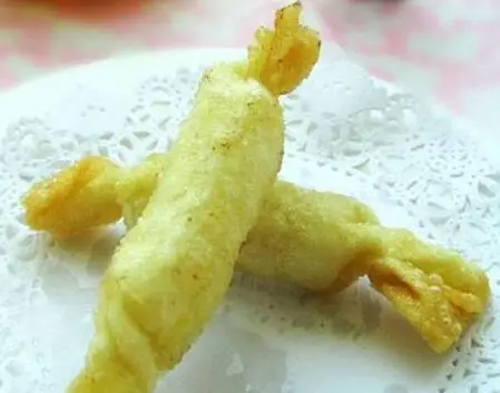 7)油烧至7成热时,下挂了糊的香蕉块慢炸