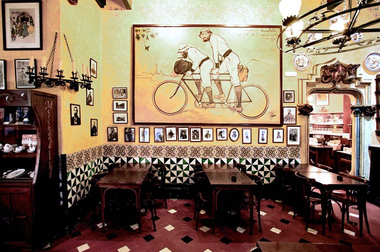 四只猫咖啡馆位于巴塞罗那蒙特斯街上,不时有游客会在门口停下来打量这座咖啡馆的小门脸和拉蒙?卡萨斯的那张画。这里曾经来过建筑师高迪、音乐家伊萨克?阿尔贝尼斯等,最有名的顾客就是毕加索了,1899年,17岁的毕加索在这家咖啡馆里举办了他的第一次展览,咖啡馆大厅仍挂着当年的画作复制品,内部的陈设与装潢让人仿佛回到巴塞罗那的黄金年代。而如今四只猫餐厅最重要的资产,竟是这些文人雅士当时在此喝咖啡时,留下的草稿及涂鸦。
