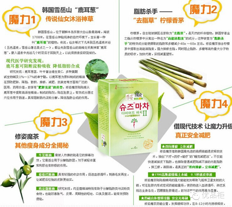 修姿魔茶贴贴瘦中的柠檬茅、鹿茸葱等多种药物精华通过“脐部通道”,疏通肠经、胃经,开通阻塞,疏通三淤,促进身体排出淤气、淤血、淤脂、旺盛新陈代谢,从而使全身脂肪开始燃烧,腰腹臀、大腿小腿、胳膊后背甚至连脚都统统瘦下来,性感曲线完美呈现。变身瘦人体质,不再担心反弹问题.