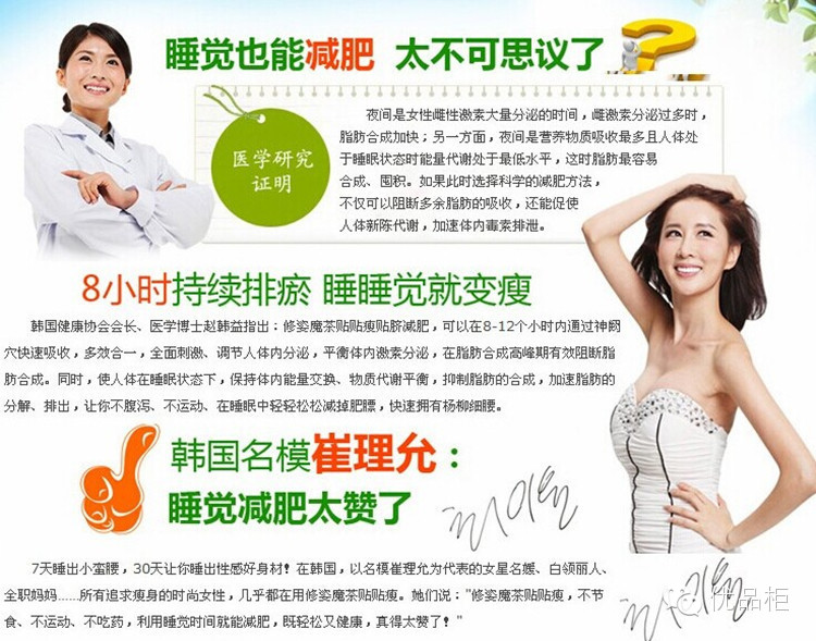 很多了解韩国的朋友,可能都知道,这个‘茶山瘦身之草’在韩国很火的,很多女星名模都在用!睡觉时贴上它,可以帮助我减掉腰腹部的肉肉,保持完美体态!”