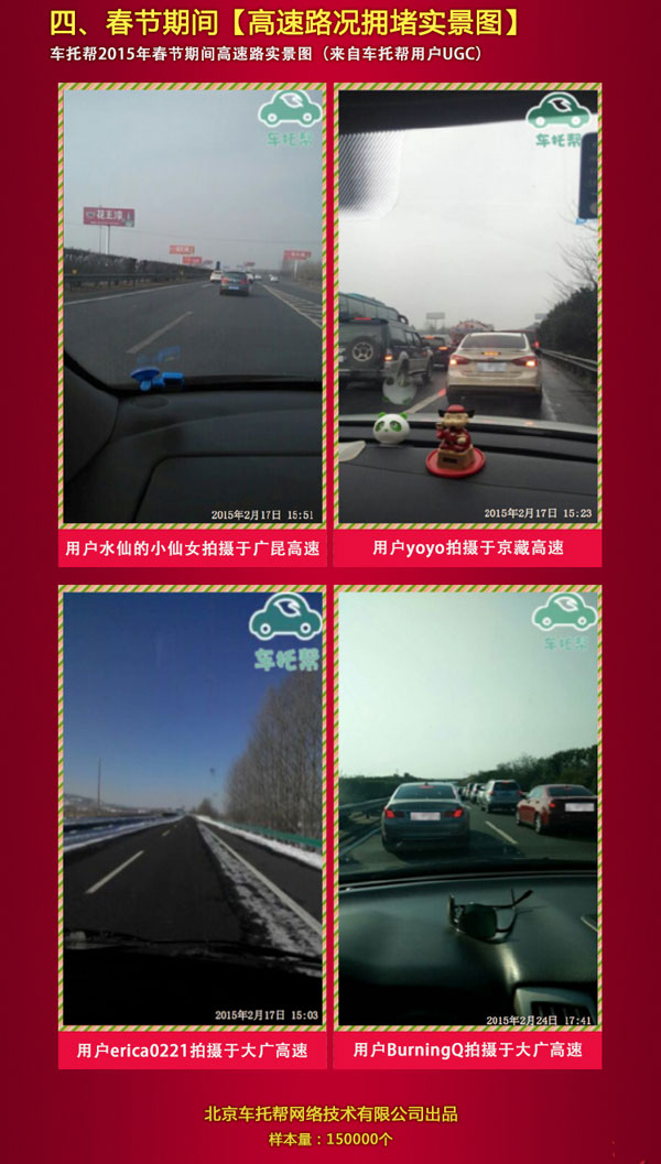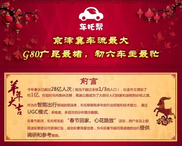春节长假结束,车托帮“春节回家 心花路放”活动也完美落幕,除了豪掷二亿的春节红包,更有通过车主上报高速路况,做出的大数据挖掘和分析。通过下面这张图来了解春节期间的高速路况吧!