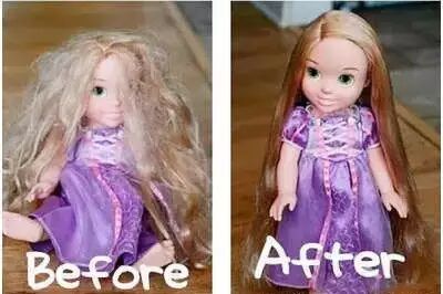 使用柔顺剂加水稀释后喷到娃娃头上,还她一头秀发!
