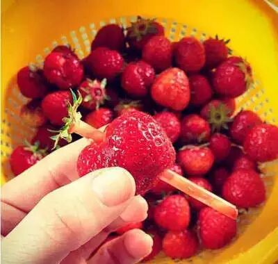 使用硬一些的吸管可以把草莓的硬茎去掉。