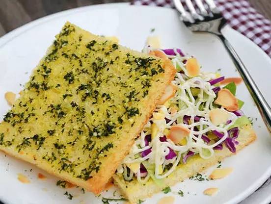 吐司片两片、鸡蛋一个、紫甘蓝一片、生菜一片、杏仁片(熟)少许、白芝麻(熟)少许、黄油15克、蒜蓉少许、欧芹少许、沙拉酱少许