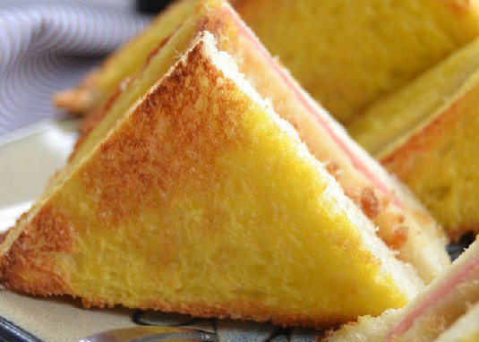 土司10片,火腿肠2根,鸡蛋3个,奶酪5片,盐少许,沙拉酱适量,番茄酱适量,巧克力酱适量。(5个量)