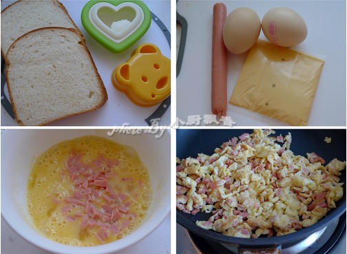 材料:吐司6片、火腿2片、鸡蛋1个、肉松适量。
