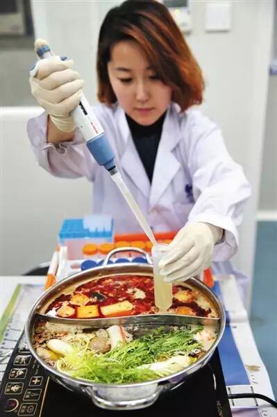 △实验人员分六个时间段从清汤锅、麻辣锅中分别吸取40ml的火锅汤装入取样瓶待检。