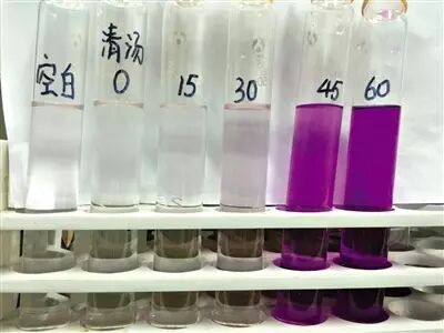 △实验人员测试清汤火锅里亚硝酸盐含量。颜色越深说明汤里的亚硝酸盐含量越高。