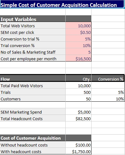 举个例子,如果你在使用Google Ad Words来为你的网站增加浏览量,那你得看看下面这份交互式表格。这个数据中显示每当一个顾客点击网站时你就得支付50美分,而在这些网站浏览者中愿意尝试你的产品的大约为5%。在尝试了之后愿意购买的大约在10%左右。这张表格中显示的是单单在潜在顾客开发过程中你在每个顾客身上就要花费100美金。 在大多数针对顾客的网站里,想要消费者花费超过100美金来买你的服务几乎是不太可能的。 而且这个花销里还没有算进销售人员工资以及维持网站所需要的经费等等。