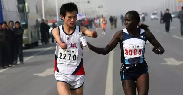 肯尼亚女跑手Jacqueline Nyetipei Kiplimo 为这位残疾运动员递水,并陪伴他从10公里跑到38公里,最后获得了第二名。