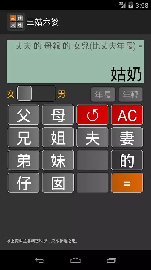 看到亲戚不知道该叫啥好什么的最讨厌了。于是临近过年之时,微博上出现了一张帮你理清亲戚关系的树状图。但是对于读图能力比较有限的童鞋来说,计算器这种输入-输出的直观模式更靠谱点。没错,我们今天要介绍的就是可以帮你算清三姑六婆的计算器App。这款计算器用“父”“母”“兄”“妻”等称谓代替了普通计算器上的数字按键,不知道如何称呼亲戚时,只要输入比较亲密的血缘关系,再层层叠加就好了。