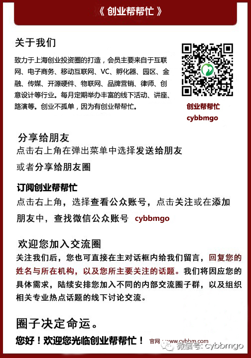 关注或扫瞄底部二维码创业帮帮忙微信公号:cybbmgo
