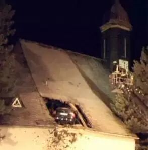 在德国东部萨克森州的林巴赫尚弗洛纳,一名23岁的年轻人驾车严重超速冲出了公路,撞断公路护栏后,冲上一个1米高的斜坡,"这个斜坡起到了跳雪台的作用",使该汽车向高处飞去,在空中飞翔了约35米后,"降落"在7米高的一座教堂屋顶上,停在了房梁上。