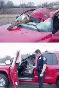 在美国明尼苏达州Wayzata,101号高速公路,一只鹿在桥上行走时受到从旁边经过车辆的惊吓,纵身跳桥而下。恰在此时,一辆道奇正在从桥下通过。鹿进了驾驶室,司机瞬间记住了“祸从天降”是什么意思。