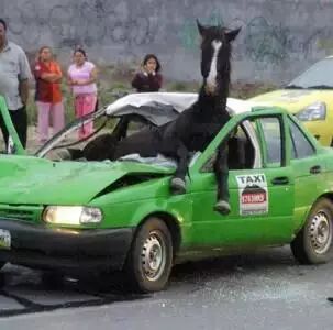 2007年12月12日,在墨西哥蒙特雷,一匹马正坐在出租车上。这匹马试图跃过该出租车,但失败,最终只有遍体鳞伤的坐在出租车上