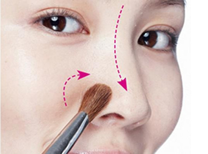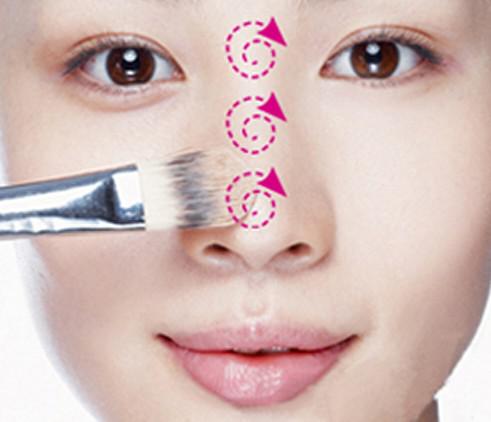 想令鼻子显得高挺,那么高光必不可少。因此在打亮T区肌肤后,在鼻梁上要以打圈的方式将高光扫在鼻梁上。注意扫的方式必须是纵向的,这样在视觉上可以有种线条延伸的感觉。