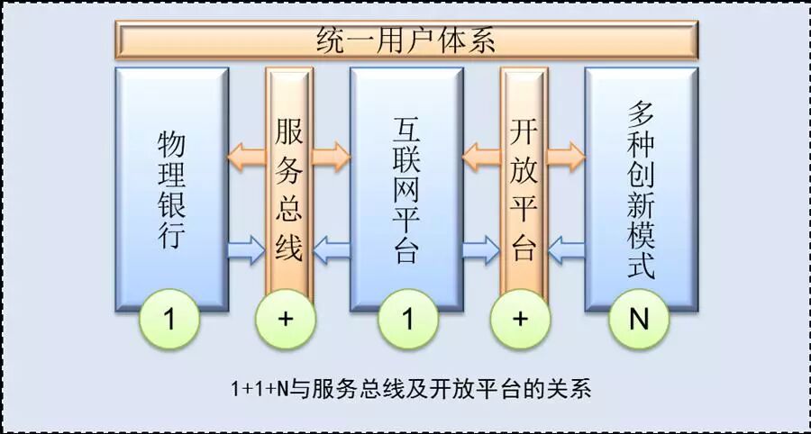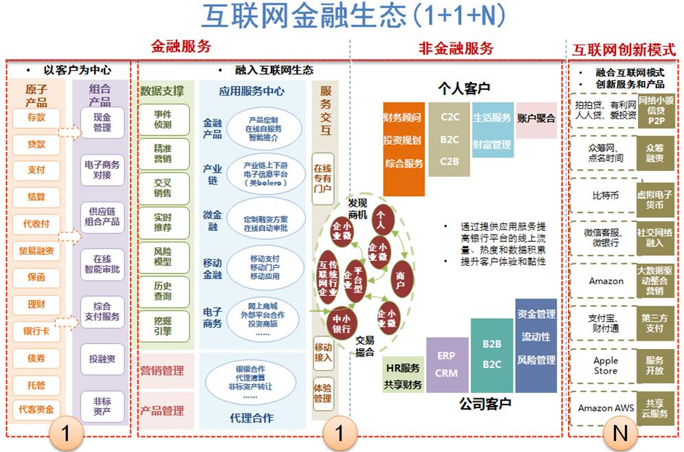 智慧银行“1+1+N”模式,参考了当下互联网企业的模式架构,结合了金融服务特点,以构建和谐共生的互联网金融生态为目标。