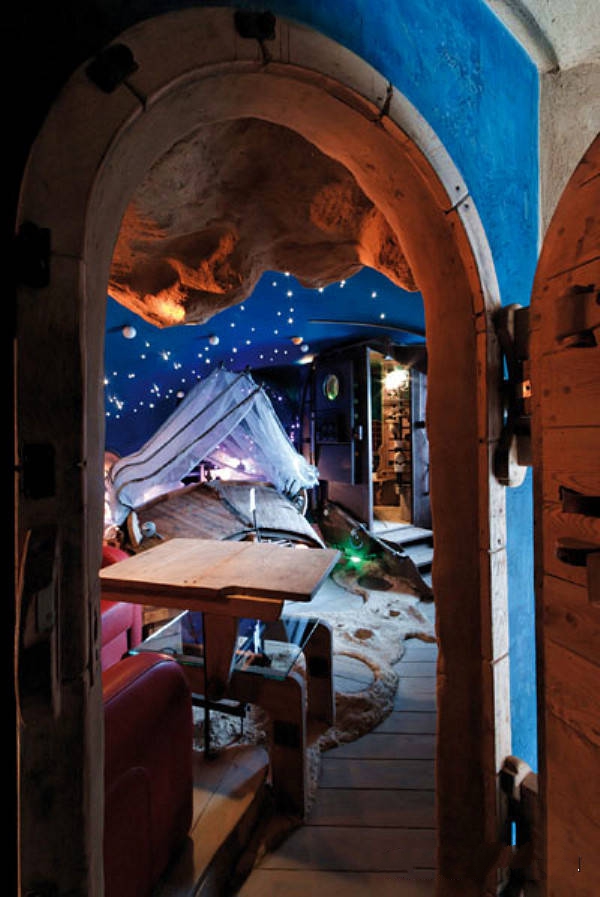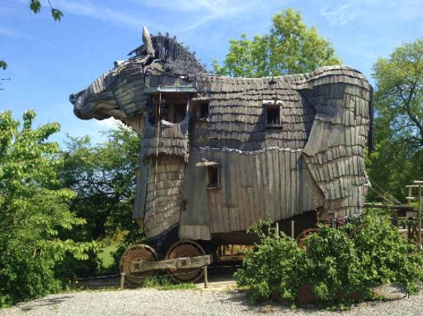 比利时La Balade Des Gnomes旅馆可谓是世上最古怪、最富童话色彩的旅馆。该旅馆外型宛如希腊神话的特洛伊木马,房间设有巨人洞穴及月球景观等主题。最有名的是“特洛伊木马房”,让孩子们重回童话世界。