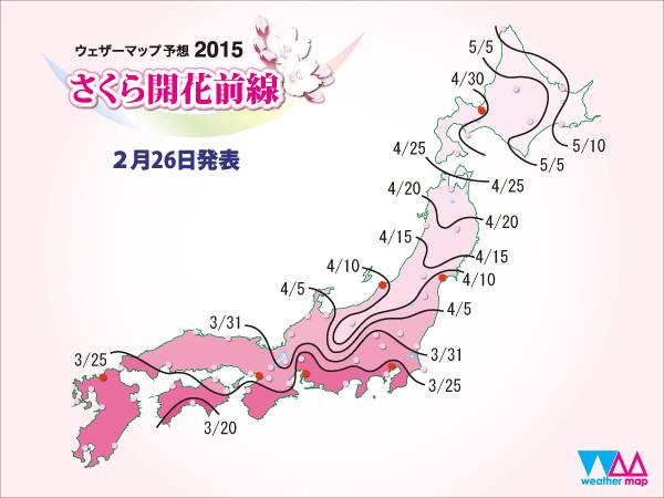 据日本气象协会预测,2015年的日本樱花开放日各地都将与往年同期。四国、近畿的某些地区将会比往年较早开花。今年的樱前线将比往年早一些的3月中旬从高知开始;九州到关东南部的开花时间为3月下旬;关东北部、北陆为4月上旬,东北地区从4月上旬开始到下旬、北海道将在5月上旬迎来开花日。