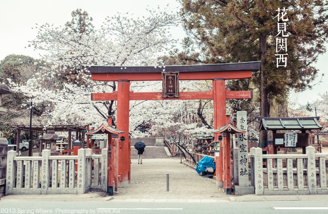 冰室神社也是拍摄樱花的好地点,门口就有一棵樱花树,和鸟居一起构成了很漂亮的画面。主殿门口有一棵巨大的樱花树,应该也是枝垂樱,只是不像大阪城公园里的那么红,是白色的。