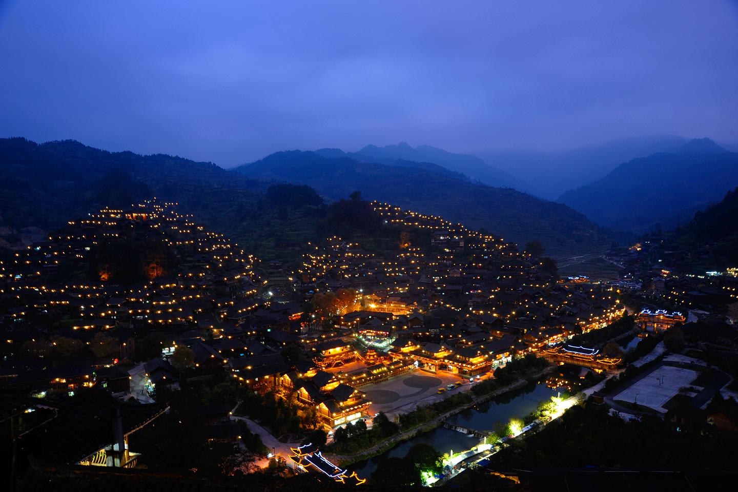 夜幕下的苗寨,点点灯光环绕其中,温馨并动人。