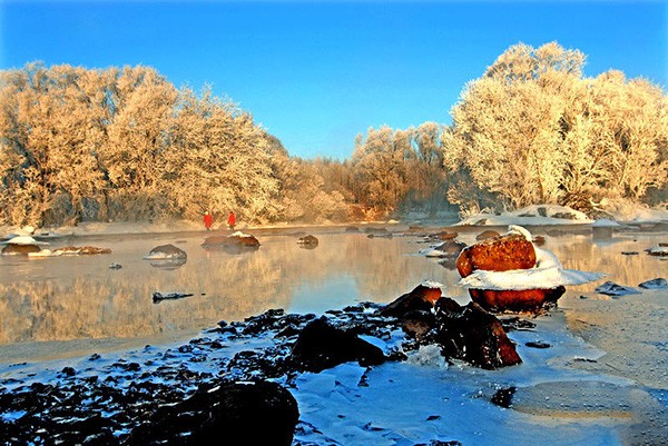 洋塘河自北向南委婉曲折地流过,冬天的时候,瑞雪飘落,整个洋塘曲景区及周边都悄悄披上梦幻的羽衣。