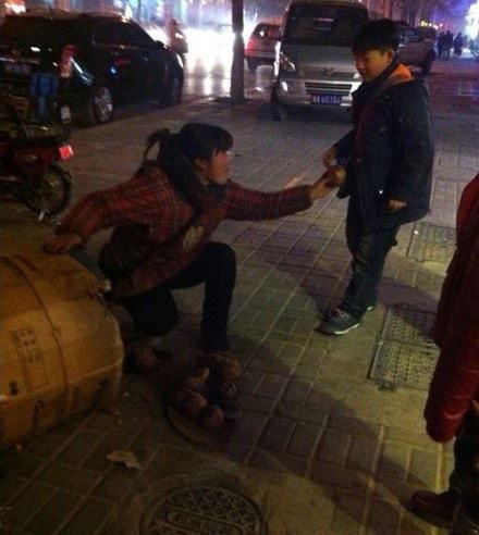 15.【12月27日晚,郑州,兴华南街,几只人员掀翻了一个烤红薯摊,大姐不敢反抗,眼里噙着泪,默默忍受着人格的践踏和屈辱,路过的小学生同情地看着眼前的一切。大姐突然起身,把还能吃的烤红薯递给孩子们吃。