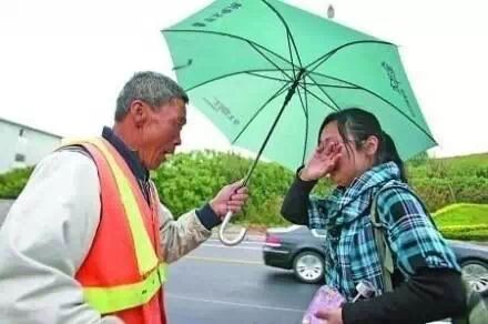02. 【 一位环卫工捡到一个女大学生的钱包,在雨中苦等2小时,终于等来了失主,女大学生赶到后,感动得直掉眼泪。见她还淋着雨,张国顺撑起雨伞上前为她遮 雨,而他自己却一直被雨淋着。这是在烟台市区月亮湾景区的公交车站点发生的很感人的一幕。祝福像这样的好心人,都能够一生平安】
