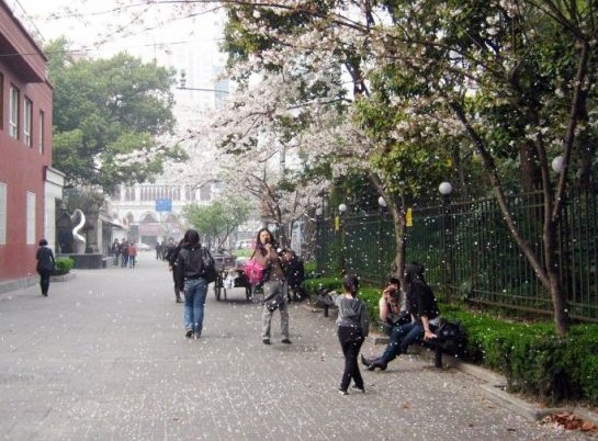 青海路位于南京西路和威海路之间,紧邻着上海电视台,也就二百多米长。这里是上海第一次将樱花树作为行道树的一条小马路。