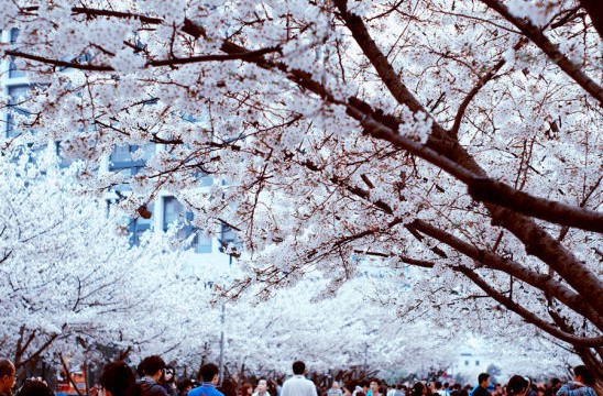 一大片的樱花林,如天边一抹白云。站在树下,仰望着满是樱花的蓝天,白色的“樱雪”,覆盖在发上,眉上,脸上,唇上,肩上。看着如此美景,仅有不断地“咔嚓咔嚓”拍照留念,看着平日里忙于工作的人们,在这暖暖春日中缓缓舒展身体,在烂漫的樱花树下惬意地走着,深深地呼吸,感受这樱花的氤氲香气。