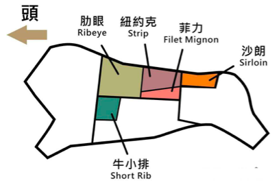 比较常吃的牛排,除了菲力,还有肋眼、西冷。肋眼就是上面图里的肋眼了,脂肪比较丰富,特别香。我们平常说的西冷呢,一般是指上面的“纽约克”这个部位,特点是嚼劲好。还有T骨牛排,以骨头为界,一边菲力、一边西冷,一次点单,两种享受。