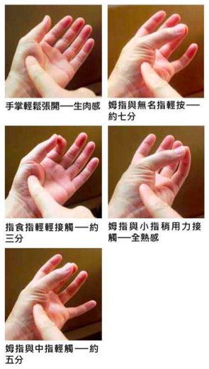 再对比一下自己的手肚子。记住,从食指到无名指,分别对应的是三分、五分、七分。如图: