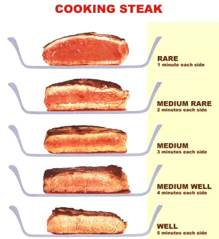 看下面这张图。我们说的三、五、七分熟,对应的就是下面中间三档:MEDIUM RARE, MEDIUM, MEDIUM WELL。吃牛排,吃的就是满溢的汁液,不然跟嚼卤牛肉有什么区别?