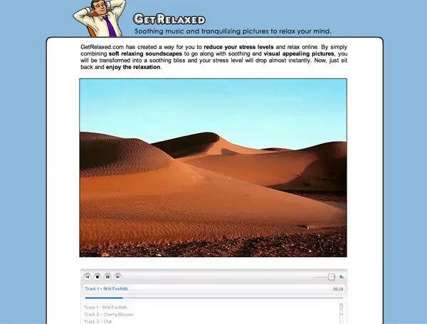 如果两分钟不足以让你彻底放松,试试这个。如下图,打开网站后,头枕着双手往后仰,欣赏自然风光,聆听网站为你精心挑选的音乐。