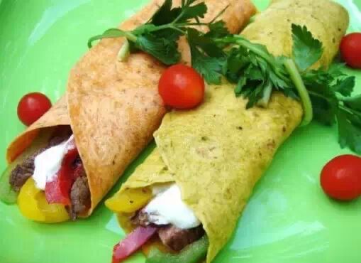 3. 饼摊开,放入圆椒洋葱条,再放牛肉条;均匀涂上taco sauce或salsa,加两勺酸奶油;将饼卷起即可