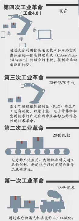 工业4.0的基础,是已经实现的前三次工业革命。按一般的划分,第一次工业革命开始于18世纪后半叶,其主要标志是以蒸汽机的发明带来的机械化生产;第二次工业革命开始于19世纪后半叶,主要标志是以电力的发明带来的电气化和大规模流水线生产;第三次工业革命开始于20世纪后半叶,主要标志是通过信息技术和电气化的结合实现的自动化生产。第四次工业革命,从现在开始,其主要特征就是综合利用第一次和第二次工业革命创造的“物理系统”和第三次工业革命带来的日益完备的“信息系统”,通过两者的融合,实现智能化生产。来自机械制造、自动技术和信息通信及软件开发等三个领域的十多家领头企业,作为三次工业革命的佼佼者,顺理成章地组成了第一梯队,成为德国工业4.0的研究者和践行者。