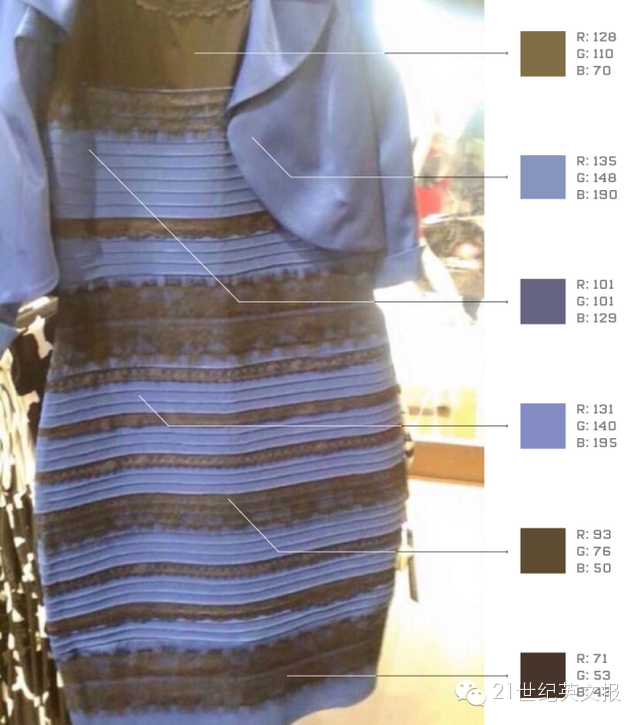 以Buzzfeed上的图片版本为例,人们看到的蓝色确实是蓝色,但这很可能是因为背景的关系,而非其真实的颜色。“看你RGB值等于R93,G76,B50的地方,如果只是看着这些数字,让你说出这是什么颜色,你会说什么?”康威问。
