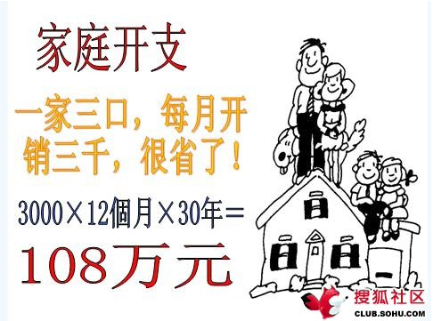 家用:108万。按一家三口吃、穿、住、行、用等,每月3000元计算。