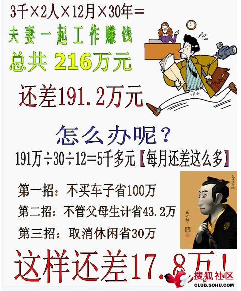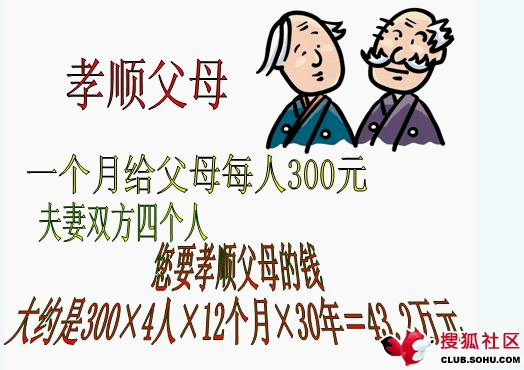 父母:43.2万。按30年每月分别给双方父母300元,一生孝顺父母费用。